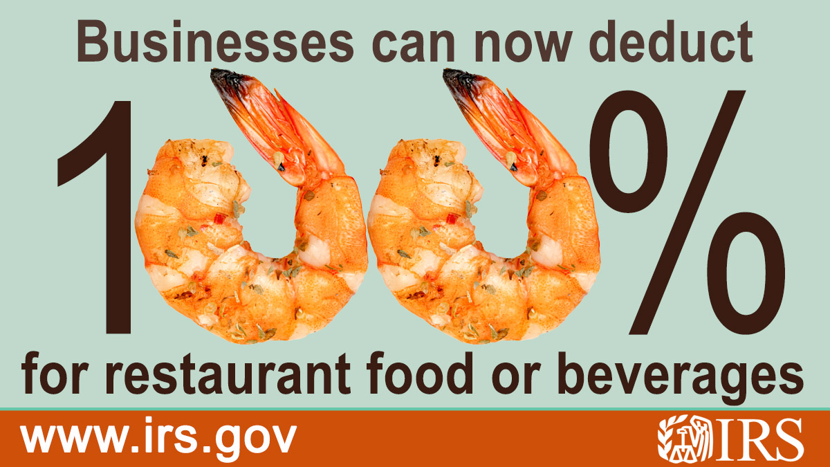 Businesses can claim 100% of their food or beverage expenses paid to restaurants between Jan. 1, 2021 and Dec. 31, 2022. See more #IRS information on guidelines at: https://t.co/Cw9K5ErVPH https://t.co/hGM6huUEHv