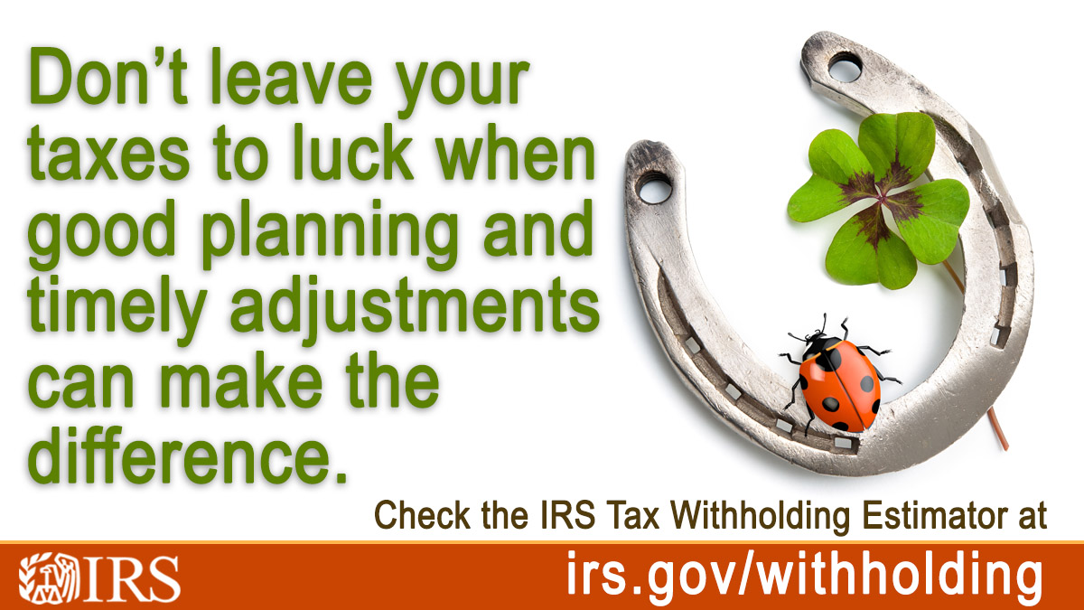 Don’t leave it to luck: Use the #IRS Tax Withholding Estimator to check whether you need to make an adjustment now to avoid an unexpected tax bill come tax time. See https://t.co/3fQSlsYHt3 https://t.co/CAGbKdYT1m