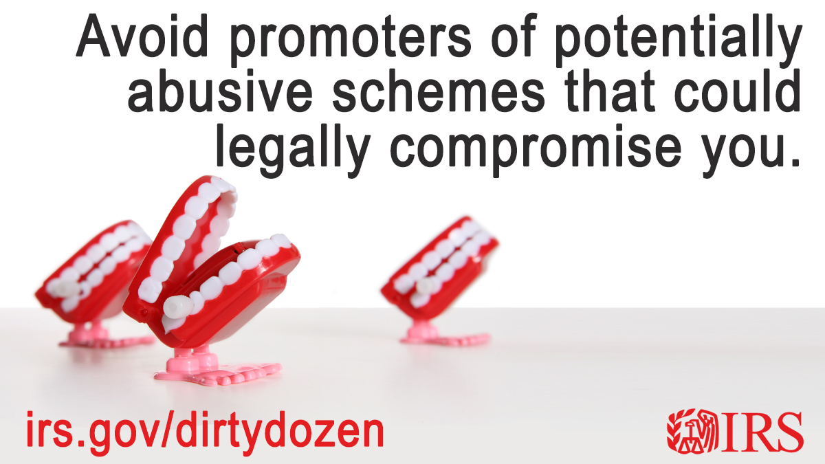 #IRS “Dirty Dozen:” For your #TaxSecurity, watch out for abusive tax schemes peddled by tax promoters. Don’t fall for it! https://t.co/HBbE6BrMFm https://t.co/9i3NVfssrO