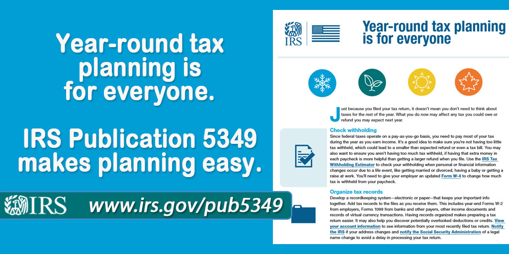 #IRS Publication 5349 outlines steps you can take now to make tax filing easier. Year-round planning is for everyone. See: https://t.co/8XagxegVd0 https://t.co/Sptjn1tMIt