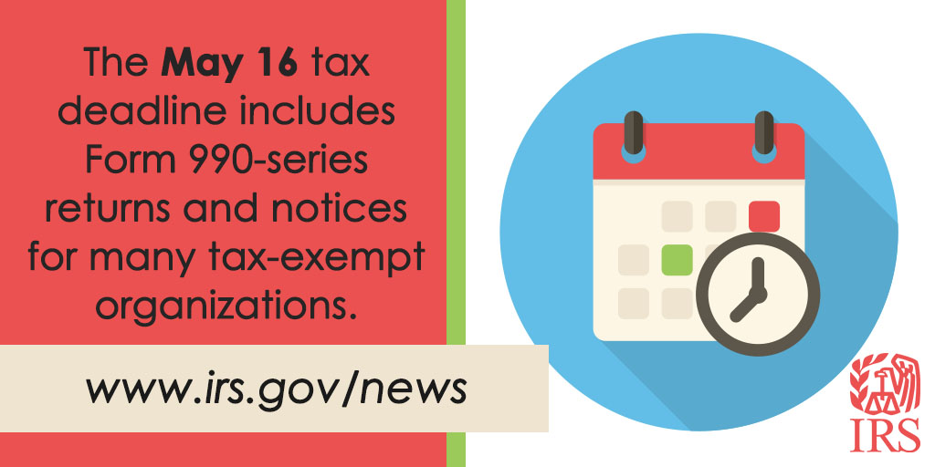 #IRS reminder: May 16 tax deadline includes Form 990-series returns and notices for many tax-exempt organizations. Learn more: https://t.co/l4jqpdE0Sl https://t.co/9kzpjU6vWm