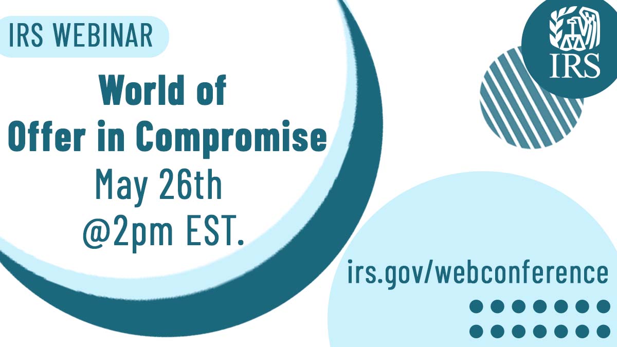 #IRS will offer a free webinar called ‘World of Offer in Compromise.’ Register to join us on May 26 at 2 p.m. (ET): https://t.co/bAebKK4Tyw https://t.co/6i0Mtdh26m