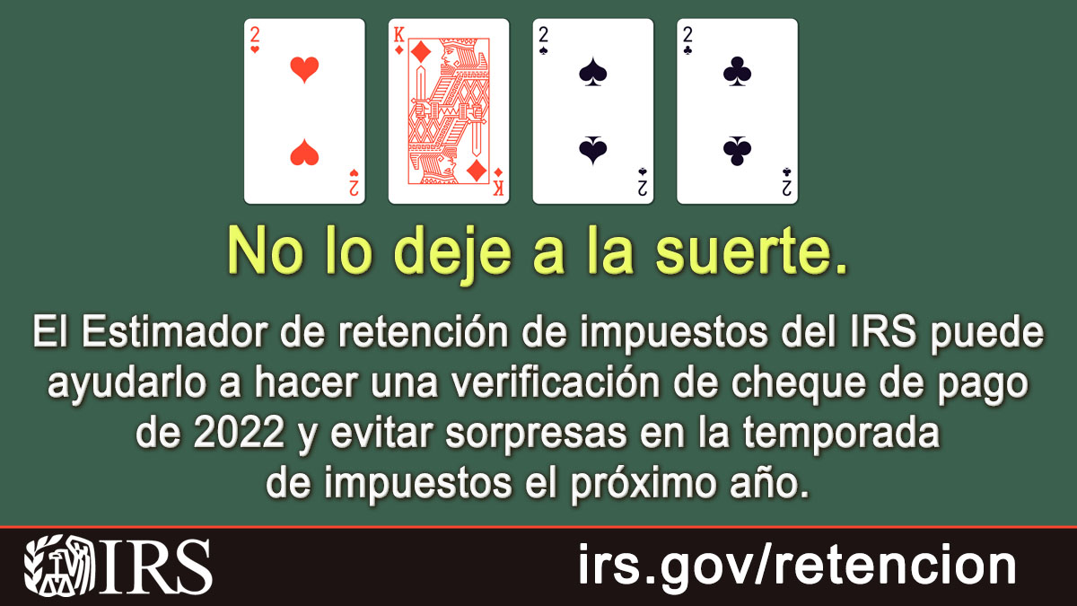 No lo deje a la suerte: Si recibió un reembolso grande o una factura de impuestos, intente usar el Estimador de retención del #IRS hoy: https://t.co/fUBANHouPJ https://t.co/eLExSKlWNz