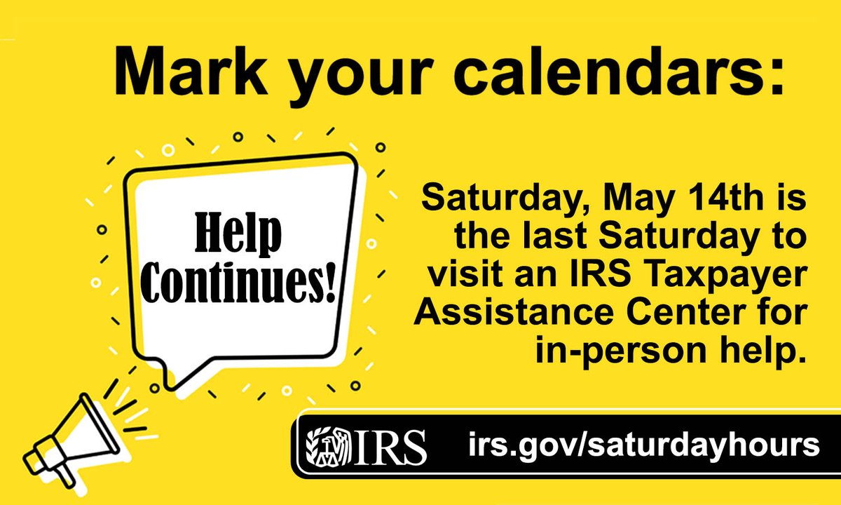 Several #IRS Taxpayer Assistance Centers have been providing taxpayers with walk-in help. Mark your calendar for May 14 from 9 a.m. to 4 p.m. for another chance. See: https://t.co/QlB2OuW2Q5 https://t.co/LsNQLiAXIJ