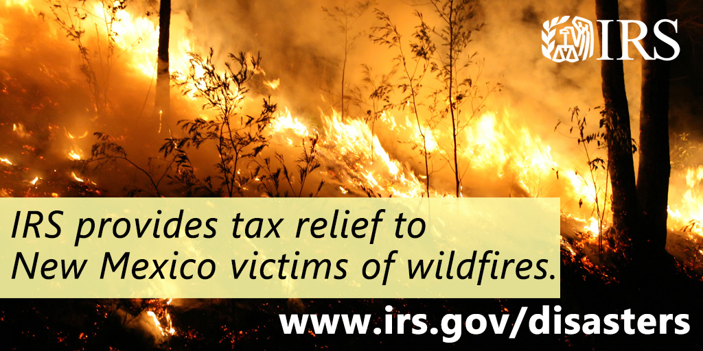 Tax relief now available to the victims of wildfires and straight-line winds in New Mexico, as part of a coordinated federal response based on damage assessments by @fema For #IRS information on this, visit https://t.co/6C2dPE8Qhr https://t.co/kljP4LbwDV