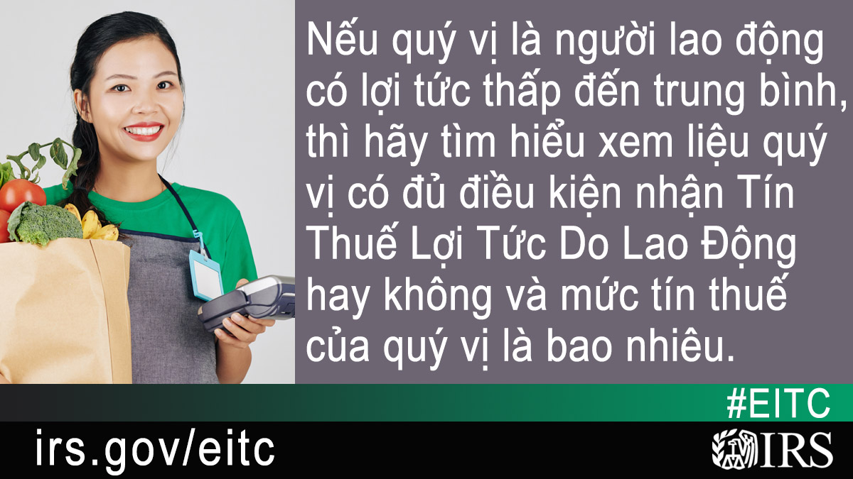 Việc yêu cầu tín thuế này có thể làm giảm số thuế quý vị nợ và cũng có thể mang lại cho quý vị một khoản hoàn thuế lớn hơn. https://t.co/T1E0gLuuB8 #EITC #IRS https://t.co/iQdUIN7w9d